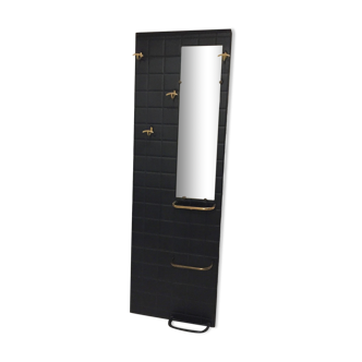 Coat rack / vintage cloakroom on foot composed of a mirror, 6 hooks, hat holder. Orange fabrics, wooden foot, two hung to fix to the wall. Original for an entry. H185cm/l60cm/p43cm. Mirror h80cm/l18cm.