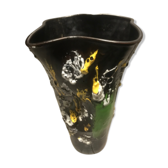 Vase in blown glass paste of yellow color with beautiful red and white ribs and slightly flared shape from the french factory la rochère. In perfect condition, this vase will find its place in the centerpiece or on any other piece of furniture in the house and will bring a vintage and colorful touch to your decoration.