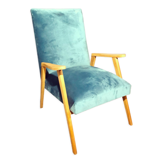 Vintage scandinavian style armchair in wood and green fabric. It is damaged by time but remains in good general condition: stable, healthy, solid and comfortable. Seat height 41cm.