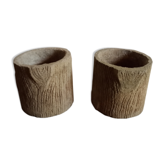 Flowerpot with saucer, ceramic, sarreguemines uc, bark pattern, tree trunk with ivy, cream color .