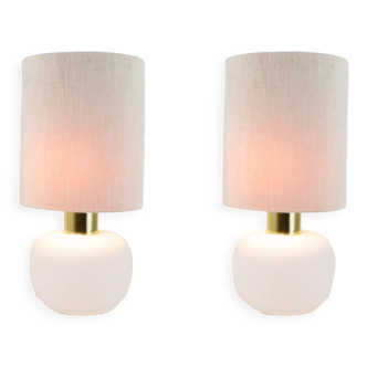 Carl Fagerlund white glass table lamps and dark ochre shades for Orrefors Sweden