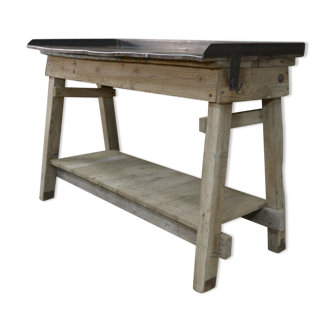 Established console in douglas, pretty knots here and there, pretty patina color medium oak. Small zinc plate on the right foot.