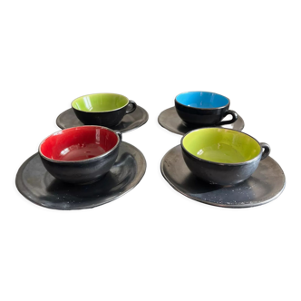Set of 3 charming vintage bistro-style coffee cups that stack easily. By Salès France. Black exterior and yellow interior. A small gold trim adorns the handle. One cup is very slightly smaller, but the difference is barely noticeable.