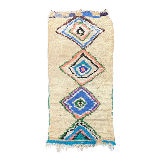 Celebrate the art of Moroccan weaving with this Azilal Moroccan rug, a stunning handwoven creation that brings cultural depth and modernity to your home. Featuring bold brown diamond patterns on a cream wool background, accented with vibrant pops of orange, pink, and blue, this rug is a striking statement piece that instantly transforms any space. Authentic Azilal Craftsmanship This rug comes from the Azilal region of Morocco's Atlas Mountains, where weaving is a vital part of cultural identity. Each rug is handmade by Berber women using time-honored techniques passed down through generations. The result is a piece that is not only functional but also deeply expressive, carrying the creativity and story of its maker. Luxurious Natural Wool Made from 100% natural wool, this rug is soft, warm, and durable. The natural qualities of wool—insulating, hypoallergenic, and durable—make it ideal for everyday use while ensuring optimal comfort. The medium pile height gives the rug a cozy texture, inviting you to savor its warmth with every step. Geometric Diamond Patterns The rug's main motif is a series of large, interconnected diamonds, woven in a deep brown on a cream background. In Berber tradition, the diamond is a powerful symbol, often associated with protection and balance. Around these bold shapes, smaller diamonds create a rhythmic, layered pattern, giving the rug visual depth and symbolic meaning. Playful Pops of Color Adding a contemporary twist to this traditional motif, the rug incorporates pops of vibrant color along its borders. Bands of orange, pink, and indigo blue enliven the composition, creating a striking contrast with the neutral tones of cream and brown.