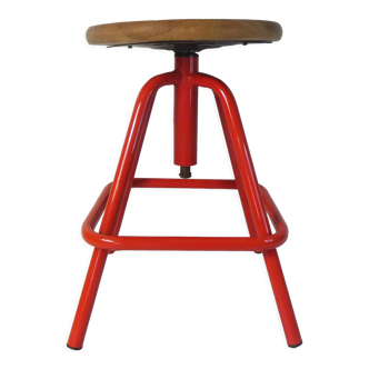 The favorite for this pair of workshop stools! Model of the 60s with a structure forming base in black angled tubular metal, foot rest bar, circular seat in red wood with screw system to adjust the height. Vintage & decorative! Good condition. Wear and tear. H: 46 / 60 cm w: 34 X 34 cm d: 31 cm.