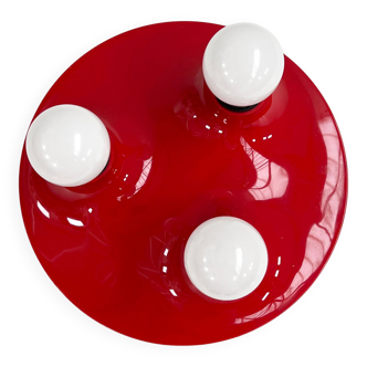 Ceiling or wall light with three lights in orange polycarbonate. The ceiling light is in very good vintage condition and in perfect working order. Diameter: 30 cm. Height: 7 cm. Fits 3 bulbs with a large socket (bulbs are not included). The lamp is in very good condition.