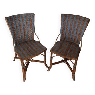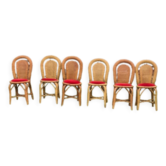 Set of 4 antique chairs, very robust construction, very stable and especially lightweight, made of bamboo and woven rattan, varnished in honey colour, in good condition despite their age.