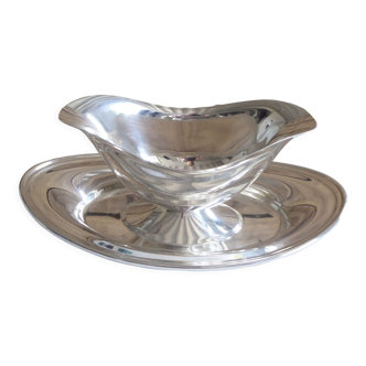 Old silver metal gravy boat, small scratches on the tray, an object which has been used with some traces of use.
