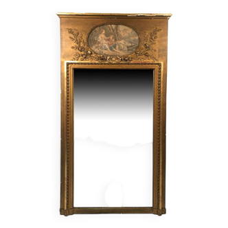 Wooden trumeau painted and decorated with an oil on panel depicting a woman with a rose in front of a statue of Cupid. Empire style. Late 19th / Early 20th century. Height 169 Width 96 cm.
