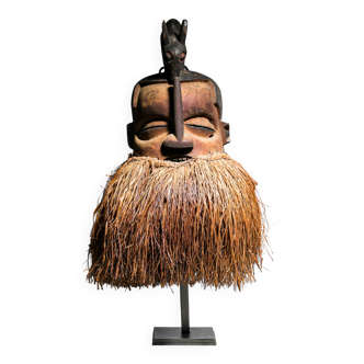 African mask in ceramic and raffia, signed "bj" on the back. Dimensions: total height 58 cm, height of the face only 30.5 cm, width 18 cm, depth 8 cm.