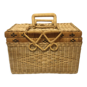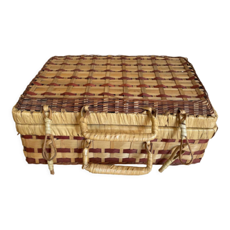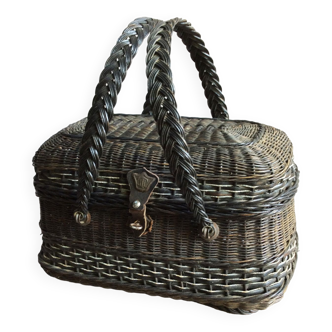 Fishing basket (musette) in wicker, leather fasteners, in very good condition. H24 X l28 X d16 cm.