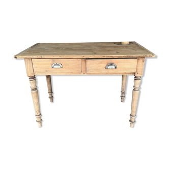 Side table, wooden desk. Completely stripped. The lower part was painted in an almond green. The tray remained just waxed raw wood. A large drawer along the length.
