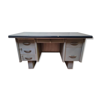 Hello. I put on sale this office of secretary brand yac, emblematic brand of the post-war period. The color is green/gray and steel. The whole is in good condition some slight splinters but very good overall appearance) The drawers work and can be locked (the key is available). Dimension: height 78cm / depth 51cm / width 156cm. These dimensions are the maximum (i.e. At the level of the tray) A cleaning of the furniture with white vinegar is recommended; -).