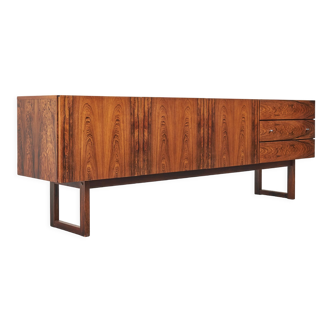 Enfilade simple des années 60, restauré professionnellement tout autour. Le buffet dispose d’un espace de rangement généreux avec un double compartiment, un compartiment simple et trois tiroirs. Les portes sont verrouillables. Les poignées simples en métal mettent un bel accent.très bon état, restauré avec des signes mineurs d’usure.