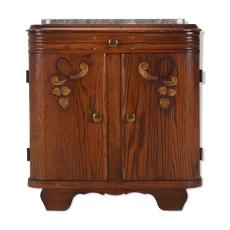 Today, I offer you an art deco style bedside table. In solid wood, the bedside is in very good condition. It has a large storage chest with a shelf. On top of the bedside is fixed a marble top. The bedside has for him very neat details such as brass fittings, triangular shaped feet etc. Very good manufacture, the bedside will sublimate the space dedicated to it. Materials: wood, brass, marble. Height: 60 centimeters. Width: 56 centimeters. Depth: 34 centimeters.