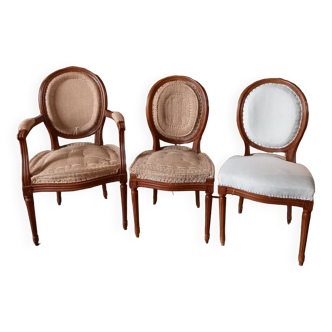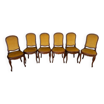 Four solid wood (cherry) and cane chairs, Louis XV style. Curved legs decorated with a foliage sculpture, carved shell on the back, handcrafted in the 1970s. Total height: 93 cm. Seat height: 46 cm. Seat width 50 cm. Seat depth 46.5 cm. Backrest height: 49 cm. Backrest width 42 cm. Good quality. Small snags on the cane of 2 seats, to be redone.
