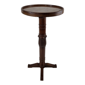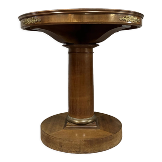Superb pedestal harness. Marquetry and bronze with central foot. It is in very good condition. There were just 4 screws added under the tray to fix it. It is a very beautiful model very decorative. There are 2 slight scratches on the tray. It is 77 cm high and 55 cm in diameter.
