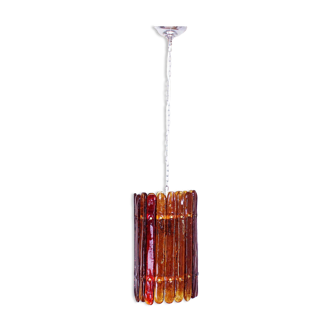 A kaiser leuchten ice glass chandelier made in germany in the 1960s. It is a fascinating lamp with its rare tubular glass shapes. Its elegant and chic look will bring a great atmosphere to any interior. A round ice glass body at the bottom with 13 frosted glass tubes and 13 polished brass tubes. The lamp hangs from a very long copper rod. The lamp requires three e27 bulbs.