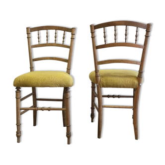 Pair of chairs in light beech "bamboo way". Removable seat cushions in upholstered velvet, showing traces of stacking... Seat height with cushion 49cm. Without 46cm.