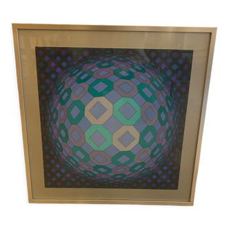 Original lithograph on glossy photo paper "Vega zett 2" circa 1975, publisher: Atelier du Griffon Neuchâtel. Commissioned and authenticated: Fondation Vasarely Aix en Provence (embossed stamp in the frame). With silver anodized frame. Aesthetic, refined and powerful, beautiful decorative effect, beautiful gift too.