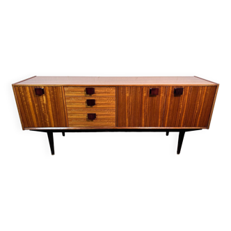 Vintage enfilade. Varnished wood, 2 shades, dark and white, wooden legs. 1.18 m wide and 42 cm deep. Height 56.5 cm at the back and 53 cm at the front. Folding door on the right, closure by clips, 23 cm high useful storage. 2 drawers on the left, useful dimensions: 34x55 cm and 8 high. Gold metal handles. Some marks, especially on a ledge (photo).