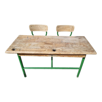 Former double school desk in iron and wood, seat height 32 cm.
