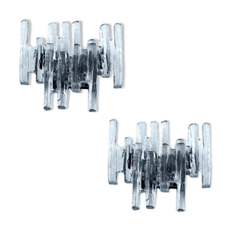 This exceptional wall lamp from the 1970s comes from the renowned Italian glass manufacturer Poliarte and was designed by Albano Poli. It is an impressive example of the brutalist design approach of that era, where raw materials and striking structures are deliberately showcased, and it is in very good condition. Each lamp is unique; no two are alike. The characteristic element of the lamp is the massive, textured glass plate with a wavy surface, which refracts and diffuses light in a fascinating way. In combination with the dark, sculptural raw iron body, an exciting contrast of transparency and weight is created – typical of Brutalism. The lamp can be hung vertically or horizontally. When switched on, the lamp creates a warm, atmospheric light with lively reflections in the glass, which convinces both as functional lighting and as a decorative statement. The master glassmaker Albano Poli designed and manufactured this lamp in the 70s for his company Poliarte.