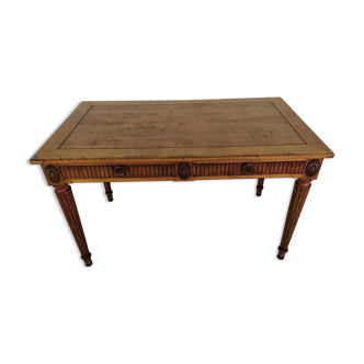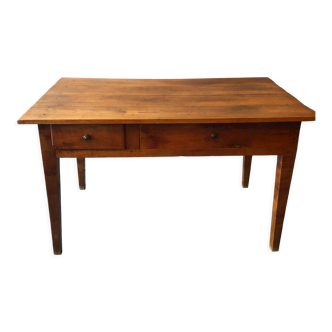 Bistro table in fruit wood and fir. Walnut patina. Good general condition with its 2 drawers.