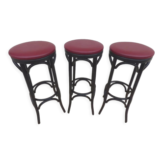4 high stools for counter or bar, seat height 71cm, attributed to thonet model from 1900/1930, curved wood and braided rattan, see photos for description, no lack of canning.