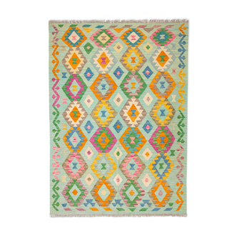 This handcrafted and authentic piece will add a touch of colour and bohemian style to your interior decor. This wool kilim is a unique piece handwoven by Pashtun men. They are a dominant ethnic group in Afghanistan, primarily located in the south and east of the country as well as in the northwestern province of Pakistan. These kilims, characterised by various geometric shapes, whether colourful or not, are part of the traditional culture of this originally nomadic people. These kilims have the particularity of being usable on both sides. They are very durable due to their dense weaving and are easy to maintain. They adhere well to the floor, but for added comfort, you can add a non-slip backing if you wish. It is a low-maintenance rug that is suitable for all rooms in an apartment: from the entrance to the kitchen, living room, and even at the foot of the bed. The kilim is a flat-woven rug and is therefore less dense and thick than a wool pile rug. "Kilim" is a Turkish word meaning woven textile, and it is used throughout the Arab world where flat-woven rugs are made. Like Berber rugs, the kilim carries a very strong cultural identity and represents the tribe from which it is woven. Thus, its patterns, colours, and wool vary according to its geographical origin. You have plenty of choices to find the one that best matches your interior decor!