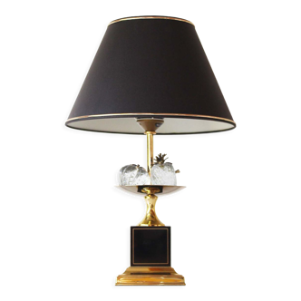 Lamp foot without lampshade of the charles house. The foot is made of golden brass and the barrel is enamelled black with golden fillet. A brass cup with 3 crystal fruits on top. Small spots inside the cup. Works perfectly.