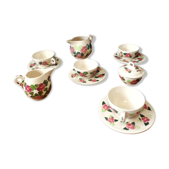 This villeroy and bosh set consists of 2 cups, a sugar bowl and a jug. One cup has enamel chips, the rest is in good condition. Cup dimensions: 6 cm high, 11 cm wide, jug: 15 cm high, 20 cm wide with handle, sugar bowl 7 cm, 17 cm wide with ears.