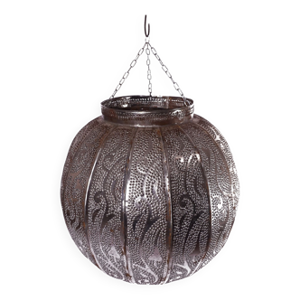 Perforated metal pendant lamp - brass socket - slight traces of time - screw bulb - ivory twisted electric textile thread -hot air balloon shape -charming.