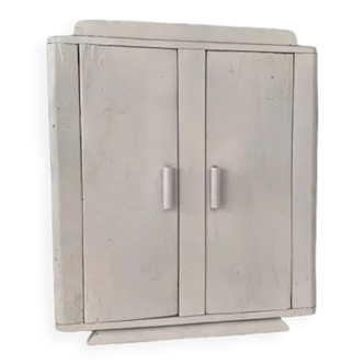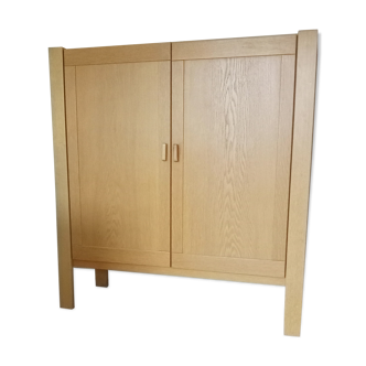 Set comprising a storage cabinet and shelves, all assembled and joined by 3 vertical studs. These studs, equipped with adjustable legs, are to be fixed to the wall. In the closed box, there are 4 shelves; enough to store dishes, folded clothes, linen or toys. The 6 shelves of light wood will allow you to have plenty of books and collectibles. A set to place in the living room, the office or in a child's room. Fully removable (except the cabinet). Period: late 60's – early 70's. Materials: light wood veneer, white lacquered wood doors, black lacquered beech studs, lacquered steel. Dimensions: width: 167.5 cm, height 220 cm; shelves: width 79 cm, depth: 25 cm; wardrobe: width: 76 cm depth: 34.5 cm, height: 119 cm. Condition: beautiful vintage condition.