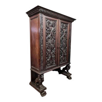 Italian Renaissance-style bookcase with caryatids in ebonized wood, circa 1680-1700. Opens on the front with two glass doors. Uprights decorated with three large antique-style caryatids. Pediment carved with a fresco. Stylized legs. H163 X W177 X D69 cm.