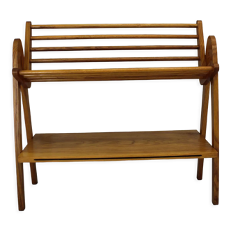 A pair of wooden wall shelves dating from the early 1950s, featuring a design that is both understated and refined. Each shelf consists of a top with delicately sculpted edges, showcasing elegant groove work on the front, along with two darker stained turned wooden rods at the back, adding rhythm and depth to the whole. This interplay of contrasts and details reflects meticulous craftsmanship, typical of decorative furniture from this period. Their elongated format makes them ideal for holding books, decorative objects, or small wall collections. One of the shelves is in very good condition. The second has two small veneer losses located on the left side (one on the edge and one on the lower part), visible but discreet and without impact on the sturdiness or overall aesthetics once in place. These are uncommon pieces, particularly interesting as a pair to elegantly and lightly structure a wall.