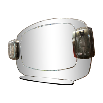 Vintage mirror from the 70s on a smoked glass frame with its 2 integrated appliques. Spherical shape 70 cm in diameter. In very good condition, with functional electrical system. Solid attachment by two metal legs. It bears the stamp of a trip, presumably to mexico, in 1980. The ideal retro design piece in the bathroom or entrance, in decoration of a hair salon / aesthetics, film set, etc... Delivery by ultra-protected shipment assured.