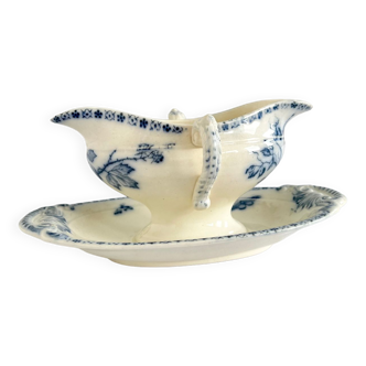 In iron earth, intense blue décor. Flower pattern. Faiencerie creil & montereau. Length: 24 cm, width (with handle): 15 cm / length of the dish: 26 cm. Good condition (1 shine, see photo).