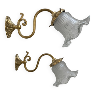 Wall light made up of a Holophane glass tulip mounted on a patinated brass gooseneck. The porcelain fixture shows some small visible imperfections in the photo. B22 socket (LED bayonet bulbs are easily available) Height: 15 cm. Depth: approximately 26 cm. Width: 14 cm. Weight: 390 g.