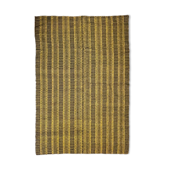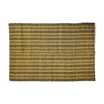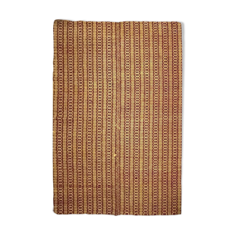 Old hand-woven mauritanian rug, made from reed and leather from tuareg communities. The mat is decorated with strips of goat and camel leather and fabrics. The weave is complex, an incredibly durable must-have for the harsh climate of nomads. These rugs are made to last a lifetime, and meet many needs - floor mats, bedding, partitions... We love the hand-dyed graphic patterns. These rugs will be perfect for giving an ethnic and timeless touch to your interior. They can easily be used on your terrace as well. Please note, this mat is old and may have defects and signs of wear, please refer to the photos. - dimensions - 125 X 154 cm.