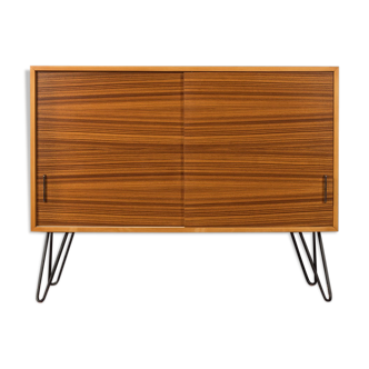 Classic chest of drawers from the 1950s with a wonderful veneer image. Corpus in zebrano veneer with two doors with stainless steel handles, a shelf and new squared steel feet in black. Quality features: Very good workmanship. High-quality materials. Made in germany. Condition & size. Good restored condition with slight signs of usage.