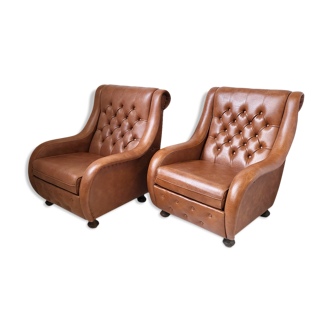 In the taste of marco zanuso superb vintage armchairs velvet fabrics of origin trace of use, legs and caps in brass. Seat height 43 height backrest 88 and 73 wide.