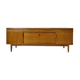 Elegant Scandinavian sideboard from the 1960s, made of teak. Dimensions: Length: 220 cm. Width: 46 cm. Height: 78 cm. 4 generously sized drawers. 4 doors fitted with handles, providing access to spacious compartments for storing crockery or decorative items. Tapered, slightly slanted legs. This sideboard is ideal for adding an elegant vintage touch to any room. This piece has been inspected and restored (sanded and varnished) in keeping with its style. Available for collection in Ixelles. Delivery possible.