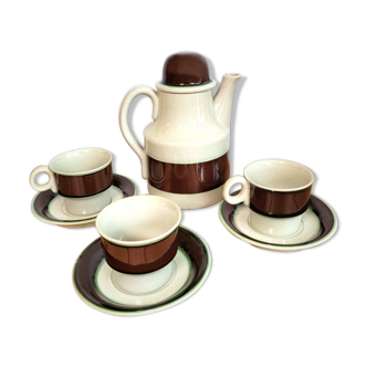Very good condition with minor signs of use. 6 cups with plate and 3 pots. Suggar pot: 10cmx10cm. Cup: 6, 5cm 8, 5cm 6, 5cm. Plate: 1, 5cm 14cmx14cm. Cream pot: 11, 5cmx11, 5cm 6, 5cm. Teapot: 23cm 22cm 10cm. Marked by producer.