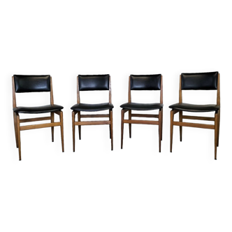 Set of 4 walnut dining chairs carved by foster mcdavid circa the 1970s original black leatherette upholstery all in very good condition except the back of a chair where there is a mini accident (see photo). The structure is made of solid and thick walnut wood. The set offers a beautiful look around a dining room table. Dimension: height 80cm, width 47cm, depth 50cm height, seat 44cm.