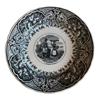 Old plate from the famous hb henriot factory in quimper. It is decorated by hand with a breton and a frieze of rinse. I measured 25cm in diameter for a height of 3.5cm and a weight of 666g.