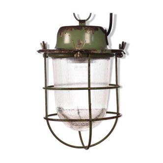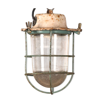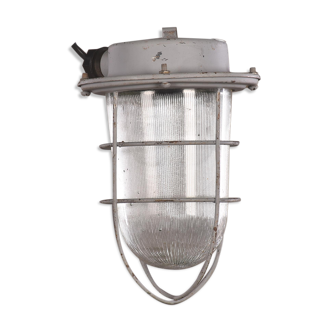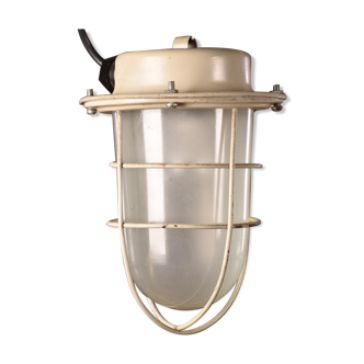 This industrial wall light was made by Elektrosvit in former Czechoslovakia during the 1970s. It features a grey metal body, a milk glass cover and an iron grid. The socket requires standard E27/ E26 light bulbs. New wire. The weight of the lamp is 1, 9 kg.