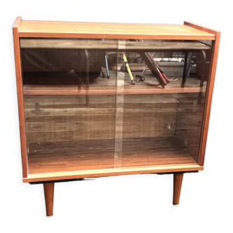 Double-sided glass counter with vintage sliding doors and tapered legs. The front and sides are glass, while the other side consists of 3 sliding doors with a central drawer. It is divided into 3 sections, each with a glass shelf. One side is stripped wood and the other retains its original white paint. The piece is in good overall condition, stable and solid with no signs of woodworm, and the glass is in good condition. Signs of wear are visible in the photos, no key included. Height: 84 cm. Width: 165 cm. Depth: 61 cm.