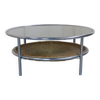 A beautiful coffee table of dutch design, made around 1960. This modern piece has a metal base that supports a round glass top and a round wicker magazine shelf. This combination of materials gives it a beautiful style that works well in many different decors and adds warmth and style. It is still in good vintage condition, with minor signs of use befitting its age and use, retaining a beautiful patina. The dimensions are: 46 cm high - 91 cm diameter.