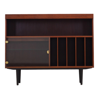 Vintage hi-fi unit on wheels in black laminate, consisting of several storage boxes, including one with a metal tubular divider for vinyl storage. This unit is in good vintage condition and shows wear related to age and use. Notable is a defect in the laminate in the record storage area, slight scratches on the metal edge, and wear on the wheels. Dimensions. Length 125 cm. Height 94 cm. Depth 45 cm. Box dimensions. Top left 50 cm X 19 cm. Top centre 45.5 cm X 24.5 cm. Bottom left 50 cm X 32.8 cm. Bottom centre 45.5 cm X 24.5 cm. Closed box top 22 cm X 27 cm. Closed box bottom 22 cm X 24 cm.